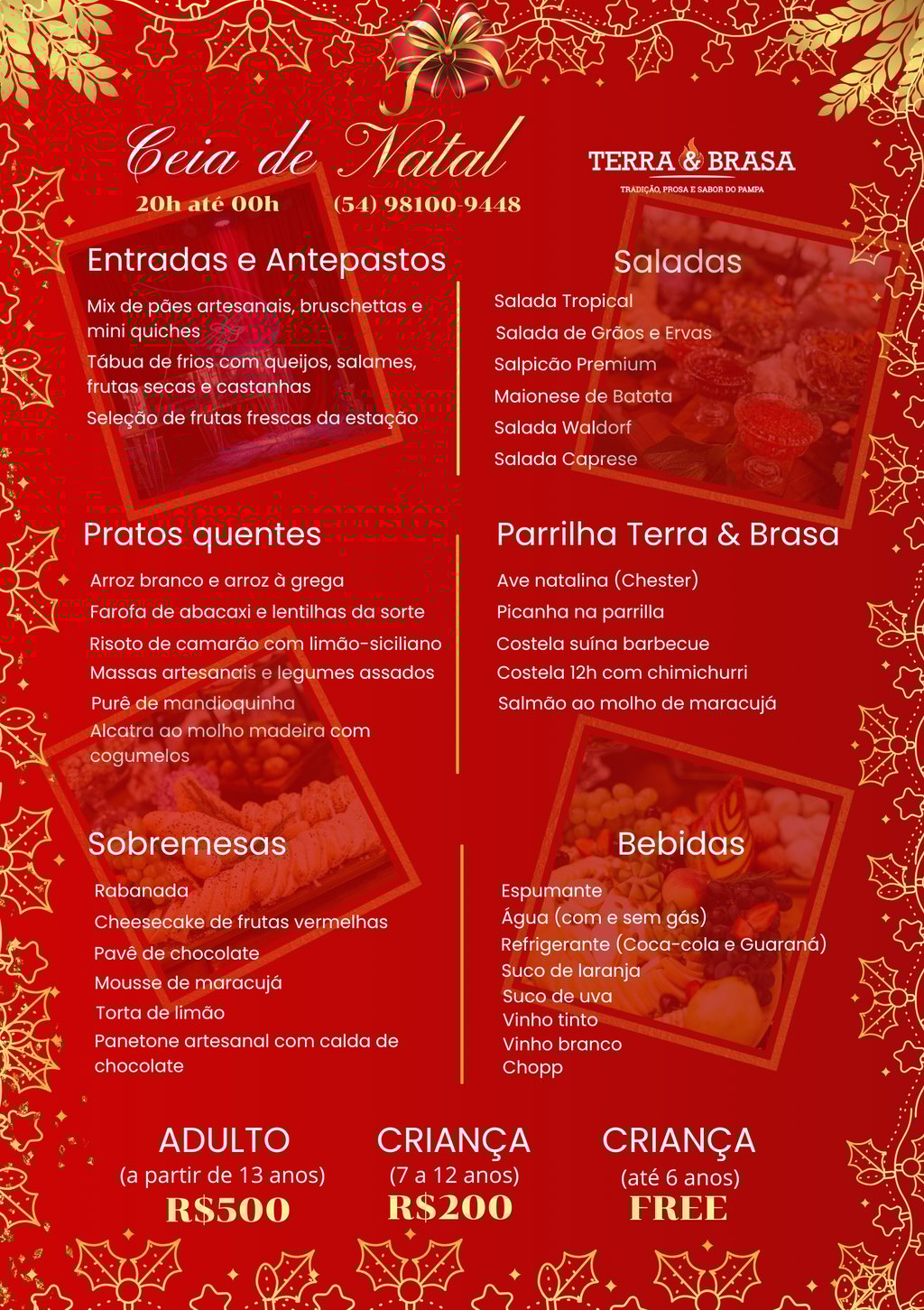 Um Jantar natalino farto e cuidadosamente preparado, com pratos frios e quentes, frutas da estação, pães artesanais, saladas, grãos e receitas especiais que carregam o toque do Terra & Brasa, sempre no sistema open food. Para brindar, chopp, espumantes, vinhos, sucos e água com e sem gás.